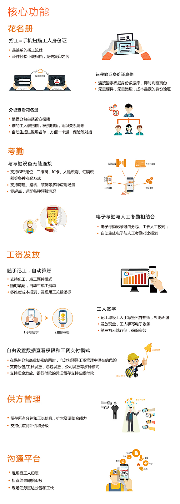濟(jì)工網(wǎng)用最簡(jiǎn)單的入場(chǎng)流程,確保工人都能納入到實(shí)名制管理體系中,是勞資雙方是否有勞務(wù)關(guān)系的有效證明。人臉識(shí)別等先進(jìn)技術(shù)保證了考勤的真實(shí)性,有效防止虛假簽到。在工資管理中由包工頭/項(xiàng)目經(jīng)理和工人雙重確認(rèn)工作量并簽字拍照,電子信息永久保存,保留證據(jù),能夠避免勞資雙方在工作質(zhì)量、數(shù)量上的異議。發(fā)放工資時(shí)由工人手寫電子收條并拍照,保證工人和公司雙方的權(quán)利,既能有效減少公司拖欠工人工資的情況,又能防止不法工人惡意討薪。