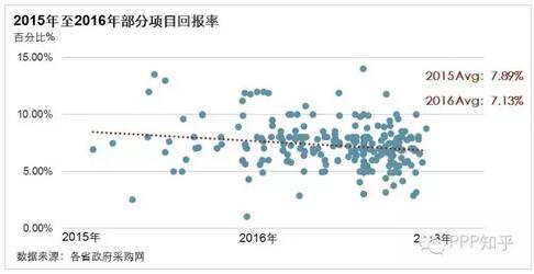 從圖中信息和具體數(shù)據(jù)中可以看出,2015年至2016年P(guān)PP項(xiàng)目的回報(bào)率有下滑的趨勢(shì),其中2015年平均回報(bào)率為7.89%(共57個(gè)項(xiàng)目),2016年8月前的平均回報(bào)率為7.13%(共184個(gè)項(xiàng)目),平均下降約0.7個(gè)百分點(diǎn)。
