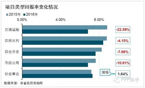 從上圖中不同項(xiàng)目類型的回報(bào)率情況來(lái)看,社會(huì)事業(yè)與其他類項(xiàng)目回報(bào)率有小規(guī)模增長(zhǎng)外,農(nóng)林水利與環(huán)境保護(hù)、交通運(yùn)輸、綜合開(kāi)發(fā)、市政公用事業(yè)四種不同類型項(xiàng)目的回報(bào)率從2015年到2016年均有一定的下浮。