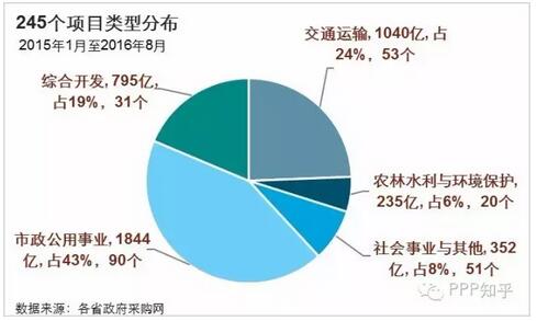 按照國(guó)家第三批PPP示范項(xiàng)目申報(bào)要求將項(xiàng)目分為5個(gè)類型,交通運(yùn)輸、農(nóng)林水利與環(huán)境保護(hù)、社會(huì)事業(yè)與其他、市政公用事業(yè)和綜合開(kāi)發(fā),各類型項(xiàng)目的占比情況如下圖所示: