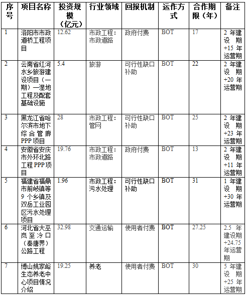 在財政部公布的43個PPP示范項目中,明文公開采用二階段設置合作期限的PPP項目有7個(當然,不排除其他PPP示范項目也有可能采取的是二階段設置合作期限,只不過尚未公布出來而不為公眾所知,或者其他PPP項目本就不適合采用二階段設置合作期限),具體如下: