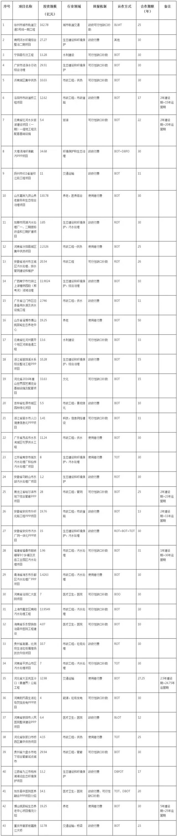 該43個PPP示范項目,均來源于我國財政部政府和社會資本合作中心官方網(wǎng)站"示范推廣"欄目中所列的示范項目,經(jīng)統(tǒng)計摘錄,按照財政部公布時間的遠近,制作成相關表格如下: