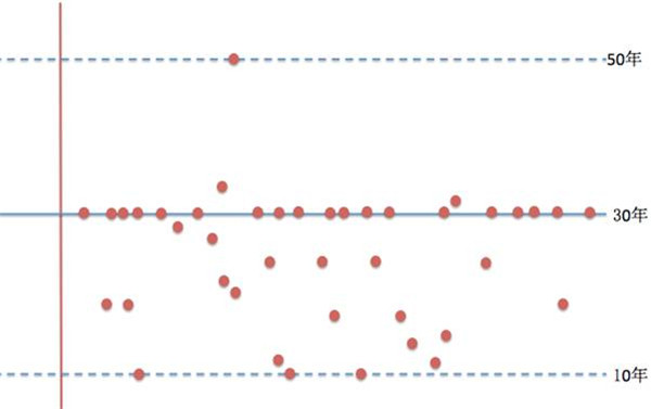 從圖中可以看出,財政部公布的43個PPP示范項目,19個PPP示范項目的合作期限均為 30年,因此其合作期限眾數(shù)值是30年。同時,絕大部分的PPP示范項目的合作期限均在10年至30年之間,具體究竟是應該是15年,22年,或者23 年,除了考慮本文前述的合規(guī)性之外,還需要考慮合理性。