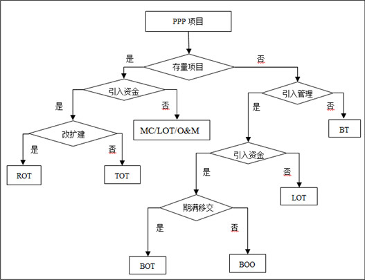 若按照是否為存量項(xiàng)目來分類的話,對(duì)財(cái)政部和發(fā)改委述及的PPP操作方式可以進(jìn)一步作如下分類(見圖1),即存量項(xiàng)目可采用O&M、MC、LOT、TOT、ROT等方式建設(shè)運(yùn)營,而新建項(xiàng)目可采用BOT、BOO等方式建設(shè)運(yùn)營。