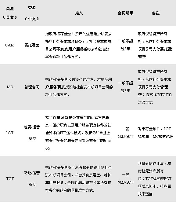 根據(jù)發(fā)改委的《指導(dǎo)意見》,PPP模式按照“操作模式選擇”可分為經(jīng)營性項(xiàng)目、非經(jīng)營性項(xiàng)目和準(zhǔn)經(jīng)營性項(xiàng)目,與財(cái)政部“收入來源”分類基本對(duì)應(yīng)。