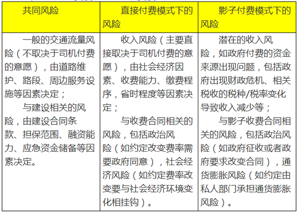 以影子收費來看,一方面,考慮到用戶不需要直接付費,影子收費使得收費公路在一定程度上可以比直接付費公路獲得更高的交通流量,間接增加了公路收入;另一方面,政府付費的信用等級一般要高于直接付費,可以在更大的程度上幫助私人部門進行融資。但我們需要考慮到,就影子付費而言,并不是說依靠政府付費就一定能夠使得項目的風(fēng)險降低,這一點還取決于政府將哪部分收入作為公路付費的來源,如其將“房地產(chǎn)稅”“消費稅”等比較穩(wěn)定的稅收收入作為來源則會降低風(fēng)險,而如將“稅收增額”或者附加有其他限定條件的收入作為來源則反而會增加額外風(fēng)險。對于新建的付費公路來說,首先,在沒有歷史數(shù)據(jù)的情況下其交通流量很難估計,而誤差越大的估計無疑意味著投資風(fēng)險的增加;其次,付費公路融資的無追索權(quán)性質(zhì)以及隨著建設(shè)本身不斷增加的投資風(fēng)險(包括公路建設(shè)、環(huán)境保護、保持道路通行、設(shè)施維護等)都在很大程度上不斷增加著項目投資的風(fēng)險(事實上在用戶直接付費的模式下,信用等級2能達到BBB等級的項目都是很少的)。