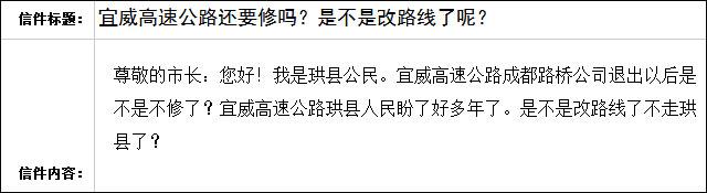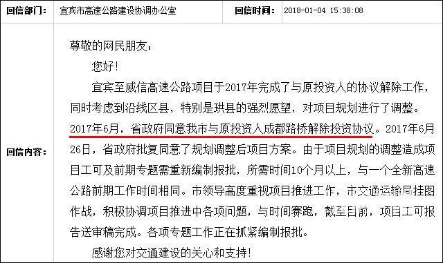 早在2014年,成都路橋就已中標(biāo)宜威高速公路四川境段BOT(建設(shè)-經(jīng)營-移交)項(xiàng)目。當(dāng)時(shí)的消息稱,該項(xiàng)目預(yù)計(jì)總投資82億元,計(jì)劃施工工期為4年。掐指一算,現(xiàn)在已經(jīng)2018年了,項(xiàng)目進(jìn)展如何了呢? 近日,已有熱心網(wǎng)友在宜賓《市長與網(wǎng)民》信箱咨詢,留言如下——