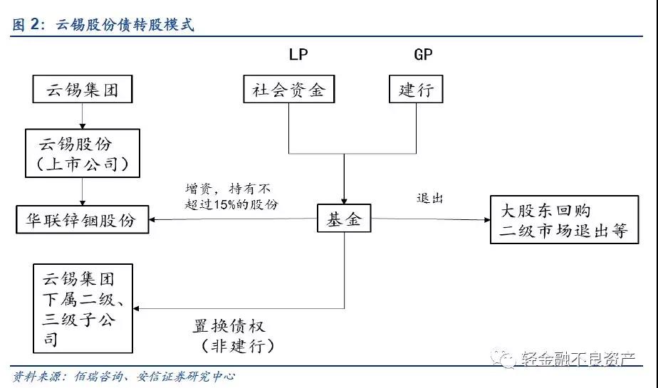 1.發(fā)股還債模式(本輪債轉(zhuǎn)股以該模式為主)案例分析:建設(shè)銀行與云南錫業(yè)股份有限公司(簡(jiǎn)稱(chēng)錫業(yè)股份,公司是云南錫業(yè)集團(tuán)有限責(zé)任公司(簡(jiǎn)稱(chēng)錫業(yè)集團(tuán))控股的國(guó)內(nèi)上市公司)債轉(zhuǎn)股項(xiàng)目。該項(xiàng)目包括云錫集團(tuán)下屬二級(jí)、三級(jí)子公司的五個(gè)子項(xiàng)目,分兩期落地,每期50億元,首期有三個(gè)項(xiàng)目。