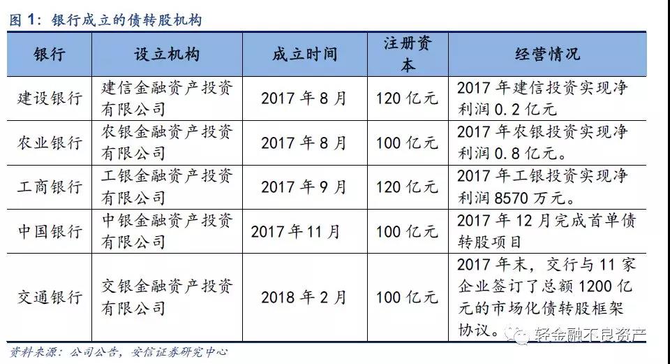 1.工行于2017年9月在南京成立工銀金融資產(chǎn)投資有限公司(簡(jiǎn)稱(chēng)工銀投資,從事債轉(zhuǎn)股及其配套支持業(yè)務(wù),具有非銀行金融機(jī)構(gòu)特許經(jīng)營(yíng)牌照)。截至2017年9月26日,工商銀行已經(jīng)與28家企業(yè)簽訂了總額3455億元的市場(chǎng)化債轉(zhuǎn)股合作協(xié)議。2017年度工銀投資實(shí)現(xiàn)凈利潤(rùn)8570萬(wàn)元。
