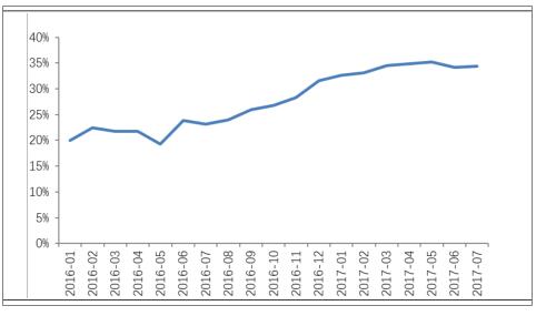 根據(jù)全國(guó)PPP項(xiàng)目庫(kù)統(tǒng)計(jì)數(shù)據(jù),截至2017年7月末,全國(guó)入庫(kù)項(xiàng)目投資額高達(dá)16.54萬(wàn)億元,同比大幅增長(zhǎng)37.49%,共計(jì)13599個(gè);項(xiàng)目落地率34.40%,比上月提升0.2個(gè)百分點(diǎn)。
