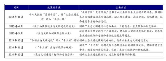 隨著政府大力推行生態(tài)文明建設(shè),生態(tài)文明頂層設(shè)計(jì)逐步完善,生態(tài)環(huán)保法制建設(shè)不斷健全。2015年4月,中共中央、國(guó)務(wù)院印發(fā)《關(guān)于加快推進(jìn)生態(tài)文明建設(shè)的意見》,明確了生態(tài)文明建設(shè)的總體要求、目標(biāo)愿景、重點(diǎn)任務(wù)和制度體系。2015年9月,《生態(tài)文明體制改革總體方案》出臺(tái),提出健全自然資源資產(chǎn)產(chǎn)權(quán)制度、建立國(guó)土空間開發(fā)保護(hù)制度、完善生態(tài)文明績(jī)效評(píng)價(jià)考核和責(zé)任追究制度等制度。近兩年連續(xù)出臺(tái)的《新環(huán)境保護(hù)法》、《大氣污染防治行動(dòng)計(jì)劃》、《水污染防治行動(dòng)計(jì)劃》和《土壤污染防治行動(dòng)計(jì)劃》將生態(tài)文明建設(shè)不斷由概念向具體操作領(lǐng)域深入落實(shí)。