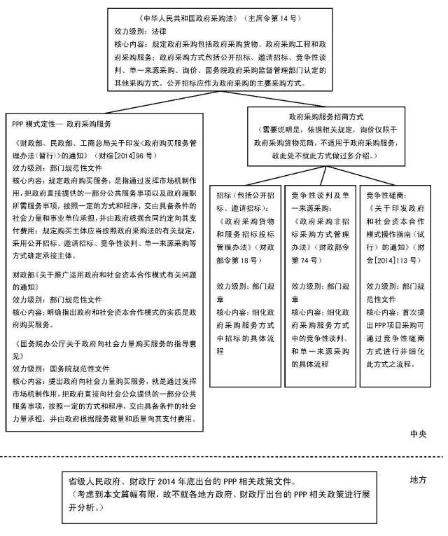發(fā)布日期為2013年9月26日的《國務(wù)院辦公廳關(guān)于政府向社會(huì)力量購買服務(wù)的指導(dǎo)意見》提出,政府向社會(huì)力量購買服務(wù),就是通過發(fā)揮市場(chǎng)機(jī)制作用,把政府直接向社會(huì)公眾提供的一部分公共服務(wù)事項(xiàng),按照一定的方式和程序,交由具備條件的社會(huì)力量承擔(dān),并由政府根據(jù)服務(wù)數(shù)量和質(zhì)量向其支付費(fèi)用;發(fā)布日期為2014年9月23日的財(cái)政部《關(guān)于推廣運(yùn)用政府和社會(huì)資本合作模式有關(guān)問題的通知》進(jìn)一步明確指出政府和社會(huì)資本合作模式的實(shí)質(zhì)是政府購買服務(wù);發(fā)布日期為2014年12月15日的《財(cái)政部、民政部、工商總局關(guān)于印發(fā)<政府購買服務(wù)管理辦法(暫行)>的通知》再次明確規(guī)定政府購買服務(wù),是指通過發(fā)揮市場(chǎng)機(jī)制作用,把政府直接提供的一部分公共服務(wù)事項(xiàng)以及政府履職所需服務(wù)事項(xiàng),按照一定的方式和程序,交由具備條件的社會(huì)力量和事業(yè)單位承擔(dān),并由政府根據(jù)合同約定向其支付費(fèi)用;規(guī)定購買主體應(yīng)當(dāng)按照政府采購法的有關(guān)規(guī)定,采用公開招標(biāo)、邀請(qǐng)招標(biāo)、競(jìng)爭(zhēng)性談判、單一來源采購等方式確定承接主體。