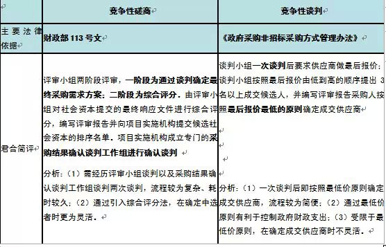 為方便PPP項(xiàng)目采購方從競(jìng)爭(zhēng)性磋商方式和競(jìng)爭(zhēng)性談判方式中作出適當(dāng)選擇,我們列明以下表格,就兩種方式進(jìn)行總體對(duì)比說明: