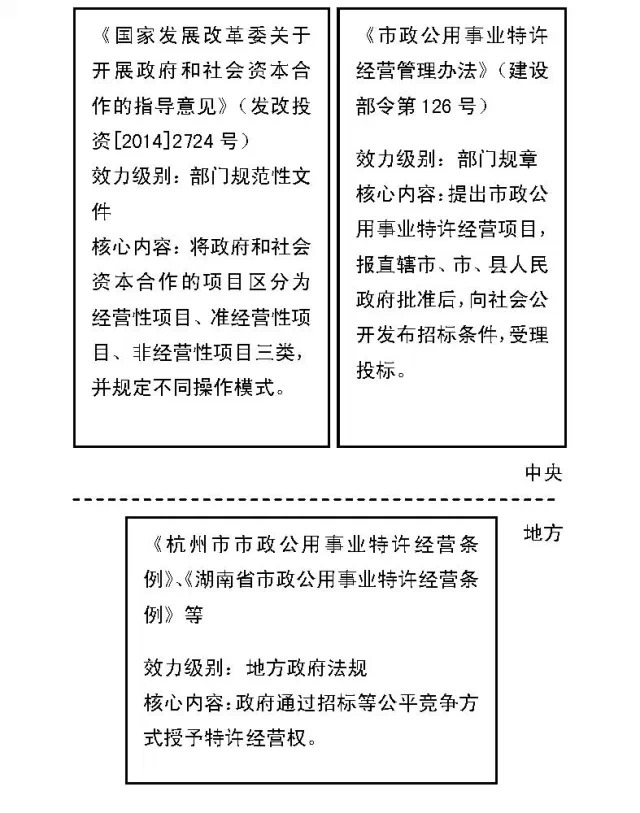 在我們與國家發(fā)改委進(jìn)行溝通的過程中了解到,國家發(fā)改委進(jìn)行上述操作方式分類的思路是,就經(jīng)營性項(xiàng)目、準(zhǔn)經(jīng)營項(xiàng)目,仍應(yīng)通過政府授予特許經(jīng)營權(quán)(準(zhǔn)經(jīng)營性項(xiàng)目附加部分補(bǔ)貼或直接投資參股等措施),采用建設(shè)—運(yùn)營—移交(BOT)、建設(shè)—擁有—運(yùn)營—移交(BOOT)(經(jīng)營性項(xiàng)目)、建設(shè)—擁有—運(yùn)營(BOO)(準(zhǔn)經(jīng)營性項(xiàng)目)等模式,依據(jù)中央層面的《市政公用事業(yè)特許經(jīng)營管理辦法》以及地方層面的特許經(jīng)營條例進(jìn)行;就非經(jīng)營性項(xiàng)目,可通過政府購買服務(wù),采用建設(shè)—擁有—運(yùn)營(BOO)、委托運(yùn)營等市場(chǎng)化模式推進(jìn),依據(jù)《政府采購法》等政府采購方面的法律、法規(guī)和政策進(jìn)行。