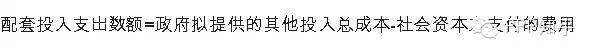 第二十二條 配套投入支出責(zé)任應(yīng)綜合考慮政府將提供的其他配套投入總成本和社會(huì)資本方為此支付的費(fèi)用。配套投入支出責(zé)任中的土地等實(shí)物投入或無形資產(chǎn)投入,應(yīng)依法進(jìn)行評(píng)估,合理確定價(jià)值。計(jì)算公式為: