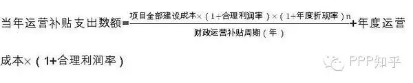 對(duì)可行性缺口補(bǔ)助模式的項(xiàng)目,在項(xiàng)目運(yùn)營(yíng)補(bǔ)貼期間,政府承擔(dān)部分直接付費(fèi)責(zé)任。政府每年直接付費(fèi)數(shù)額包括:社會(huì)資本方承擔(dān)的年均建設(shè)成本(折算成各年度現(xiàn)值)、年度運(yùn)營(yíng)成本和合理利潤(rùn),再減去每年使用者付費(fèi)的數(shù)額。計(jì)算公式為: