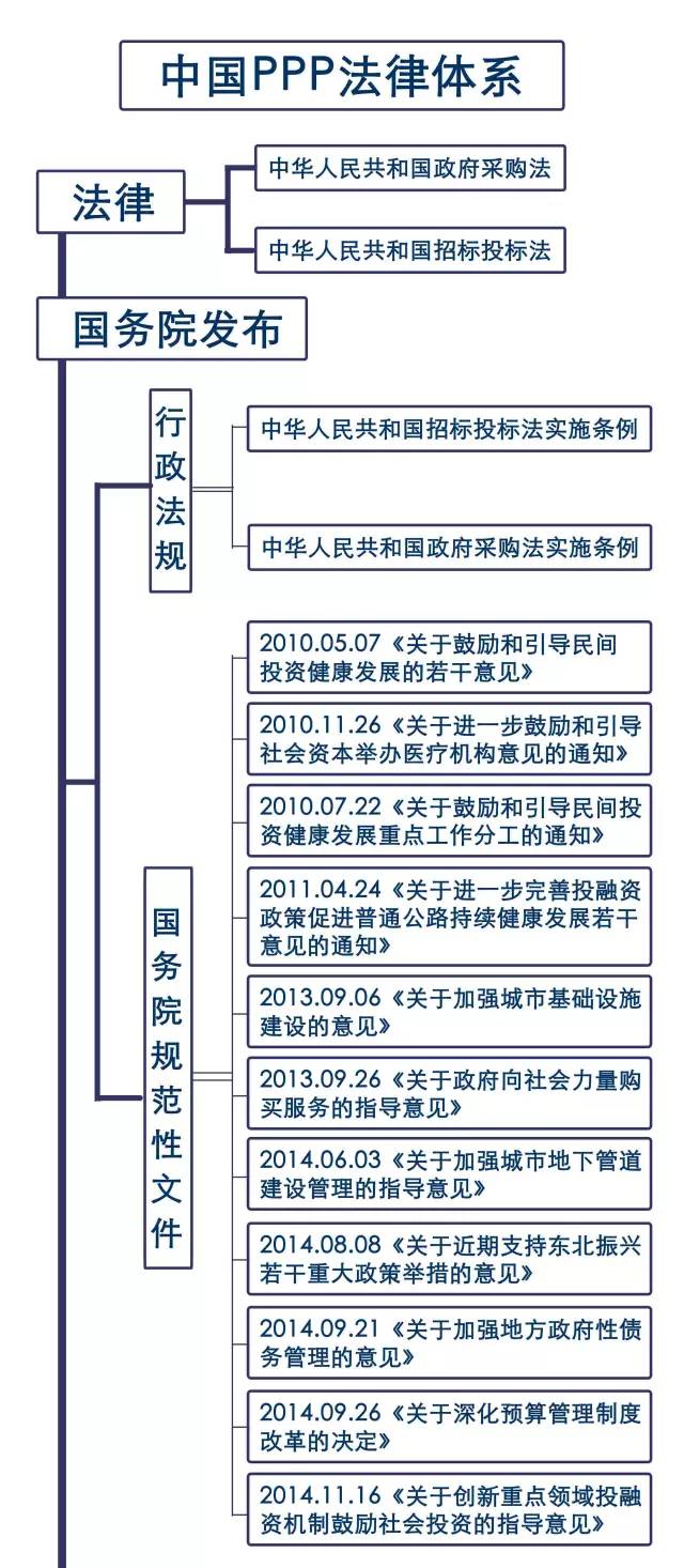 隨著我國市場經濟的不斷發(fā)展,民間經濟規(guī)模體量都在大幅提升。同時因為公共服務多樣化,基礎建設投資多樣化的發(fā)展,PPP項目日益普遍出現在我們身邊。在這樣的背景下,法律法規(guī)也正“迎頭趕上”。今天,小編梳理的我國目前PPP相關法律體系。一張樹狀圖讓目前我國的PPP相關法律法規(guī)“一覽無遺”。