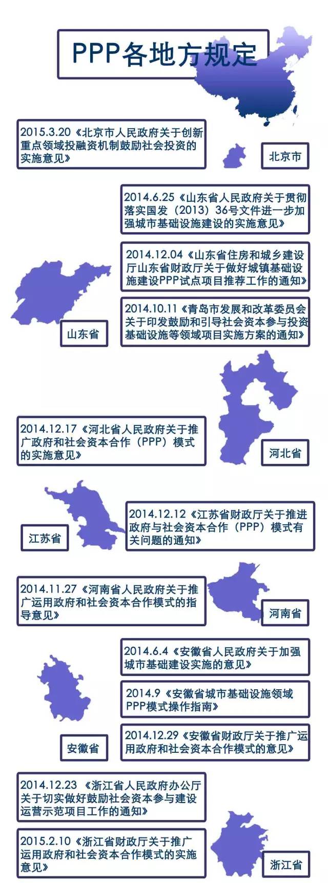 從上圖我們可以看出,全國大部分的省級行政區(qū)都開始著手進行PPP有關項目的規(guī)范性文件、指導意見的頒布與實施。其中山東省、安徽省自2014年以來分別出臺了3部意見及通知,四川省在2014年以來出臺4部意見及通知居全國首位。
