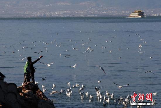 正在洱海邊給紅嘴鷗喂食的民眾。
