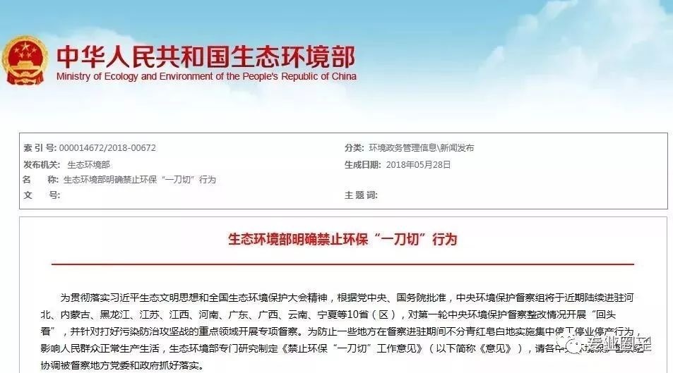 一、國家生態(tài)環(huán)境保護部《禁止環(huán)保“一刀切”工作意見》