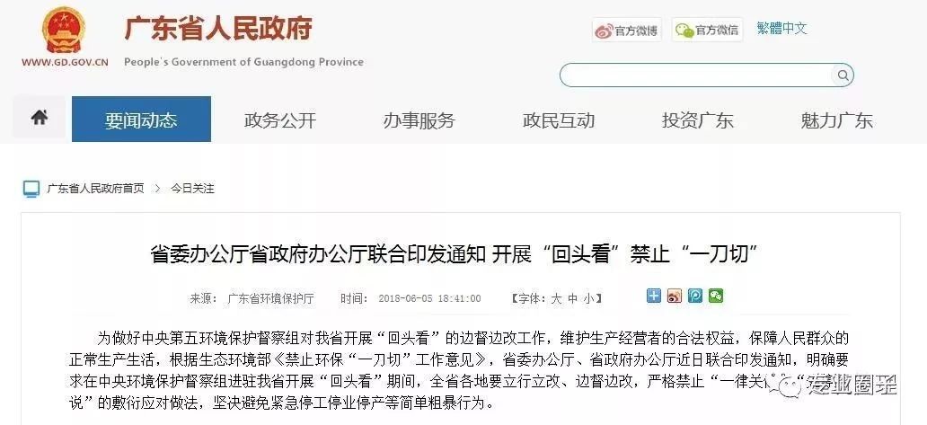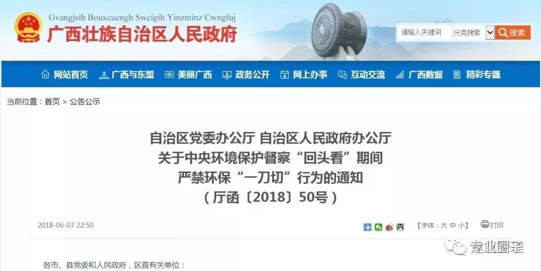 2018年6月7日廣西發(fā)布關(guān)于中央環(huán)境保護督察“回頭看”期間嚴(yán)禁環(huán)保“一刀切”行為的通知(廳函〔2018〕50號),明確提出: