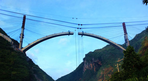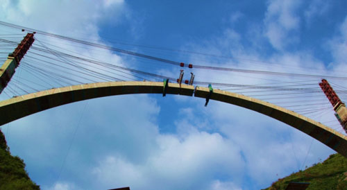 為了達到設計要求的理想成橋狀態(tài),公司與國內知名橋梁研究機構、團隊密切合作,組建現場專家工作組攻堅克難。每一個環(huán)節(jié)施工之前均作了電腦仿真計算,每一階段的實測數據隨時修正理論模型參數。與此同時,施工單位還大膽改進了傳統(tǒng)的工法,如對節(jié)段榫頭、索力張拉和標高調整等常規(guī)手段都作了全面的創(chuàng)新。這些創(chuàng)新措施提高了效率,降低了風險,改善了結構受力,也使得拱圈吊裝精度控制誤差達到了毫米級別,確保了渡槽吊裝的順利完成,為同類工程施工提供了寶貴的經驗。一道砼式“彩虹”橫掛天際