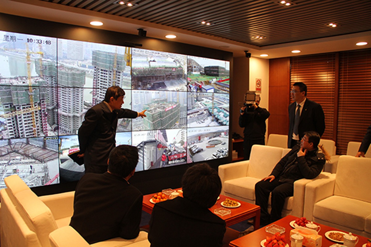北京市政府質(zhì)量管理獎現(xiàn)場評審環(huán)節(jié)專家查看三建公司現(xiàn)場實時監(jiān)控系統(tǒng)。