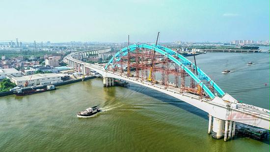 8月16日,穗莞深城際軌道交通項目全線重難點控制性工程——橫涌海特大橋主橋180米連續(xù)梁拱橋鋼管拱實現(xiàn)合龍,該橋為目前我國城際鐵路跨度最大的鋼管混凝土拱橋。 橫涌海特大橋位于廣東省東莞市中堂鎮(zhèn)境內(nèi),全長1175米,主橋跨徑(90+180+90)m,為預(yù)應(yīng)力混凝土連續(xù)梁與鋼管混凝土拱組合結(jié)構(gòu),采用“先梁后拱”的施工技術(shù)。整個鋼管拱總重量達(dá)682噸,為實現(xiàn)高精度安裝,十四局穗莞深城際SZH-5標(biāo)項目部采用原位高空拼裝工藝,僅用 46天就完成了鋼管拱橋的拼裝施工,比原定計劃提前20天,創(chuàng)造了同類拱橋施工的最快紀(jì)錄。