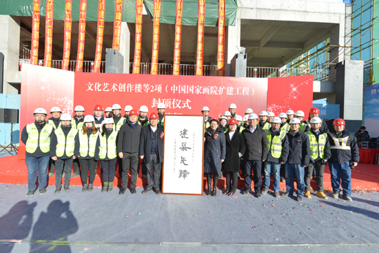 1月8日,中建一局六公司履約的中國國家畫院擴(kuò)建工程現(xiàn)場彩球飄飄,“喜封金頂”的紅色賀幅條條排列,寫有“中國品質(zhì)時(shí)代先鋒”和“工業(yè)建筑的先鋒南征北戰(zhàn)的鐵軍”的醒目標(biāo)語隨風(fēng)飄揚(yáng)。藍(lán)色潔凈的天空未掛一絲云彩,冬日的暖陽映照在洋溢著自豪和幸福的張張笑臉上。經(jīng)過建設(shè)者們一年的拼搏奮戰(zhàn),主體結(jié)構(gòu)實(shí)現(xiàn)了順利封頂。