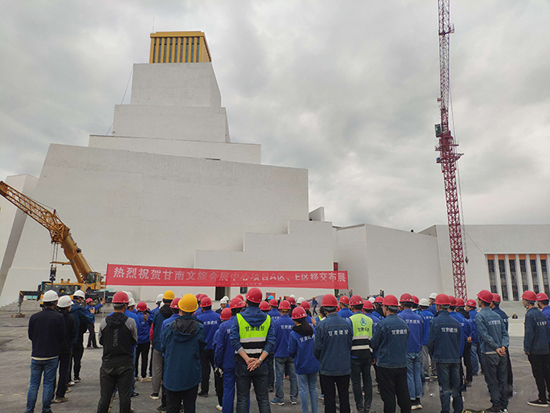 6月30日,隨著甘南文旅會展中心金頂真容乍現(xiàn),項目部全體人員歡欣鼓舞——經(jīng)過100天奮戰(zhàn),甘肅建投一諾千金,主場館項目A區(qū)、E區(qū)在 6月30日如期完工,交付布展,將不可能變?yōu)榱爽F(xiàn)實。