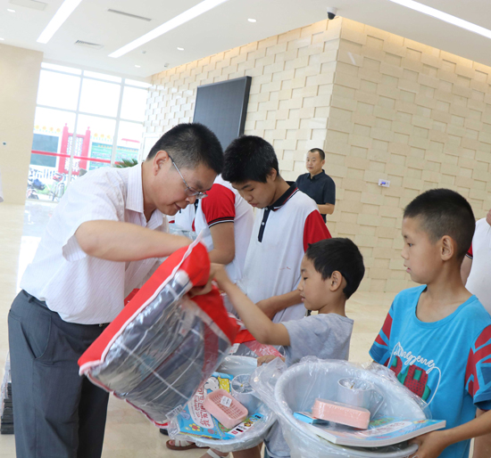 在特教中心的一樓大廳,孩子們排著整齊的隊(duì)伍向大家問好,孩子們稚嫩的小臉上難掩喜悅之情,涿州市殘聯(lián)理事長(zhǎng)舒濤與天保集團(tuán)副總經(jīng)理李國(guó)棟親手為孩子們送上禮品,希望孩子們勤奮學(xué)習(xí)、快樂生活,將來成為國(guó)家的棟梁之才。隨后,各代表隊(duì)隊(duì)長(zhǎng)為孩子們送上臉盆、畫冊(cè)、夏涼被等物資,孩子們禮貌的接過禮物,并用手語表示了感謝。