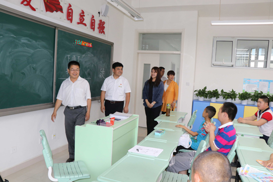 隨后在特教中心老師的引導(dǎo)下大家參觀了學(xué)校教室、康復(fù)室、學(xué)生宿舍、報(bào)告廳等地,進(jìn)一步了解了學(xué)生們的生活學(xué)習(xí)狀況,并在教室中和孩子們一起唱歌、做眼保健操。