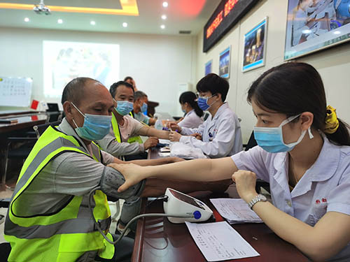 在體檢現(xiàn)場,工友們早已井然有序的排起了長隊等待體檢。受項目部的邀請,這次負責體檢的咸陽市彩虹醫(yī)院的醫(yī)生一大早便趕到項目部,內(nèi)科、外科、核酸檢測等體檢項目一應俱全。“俺們平時都忙,趕著時間掙錢呢,得點小病,抓點藥就過去了,連醫(yī)院都不去,更別說體檢這檔子事了,今天真的是一個難得的機會,感謝項目部還想著我們。”50歲的鋼筋工孫昌明邊體檢邊高興地跟項目部志愿者說著。