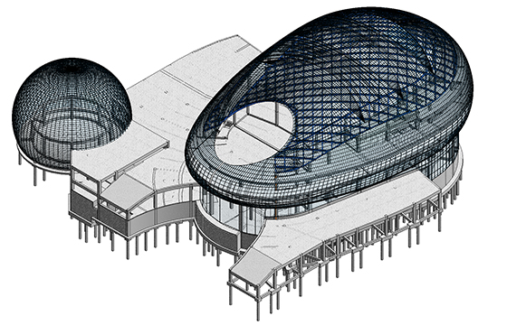 本工程為異形建筑,專業(yè)齊全,應(yīng)用難點(diǎn)較多,整個(gè)項(xiàng)目應(yīng)用團(tuán)隊(duì)配備顧問(wèn)團(tuán)、BIM應(yīng)用組、項(xiàng)目應(yīng)用組。顧問(wèn)團(tuán)隊(duì)配備2人,以總公司BIM中心為主的團(tuán)隊(duì),負(fù)責(zé)科技館結(jié)構(gòu)、BIM應(yīng)用技術(shù)支持;BIM應(yīng)用組配備4人,以分公司以及專業(yè)公司技術(shù)質(zhì)檢部為主的團(tuán)隊(duì),負(fù)責(zé)整個(gè)項(xiàng)目土建、機(jī)電BIM模型搭建、深化設(shè)計(jì)、施工階段、運(yùn)維交付處理;項(xiàng)目應(yīng)用組配備2人,以項(xiàng)目技術(shù)員為主的團(tuán)隊(duì),負(fù)責(zé)項(xiàng)目應(yīng)用實(shí)施推進(jìn)、數(shù)據(jù)反饋。