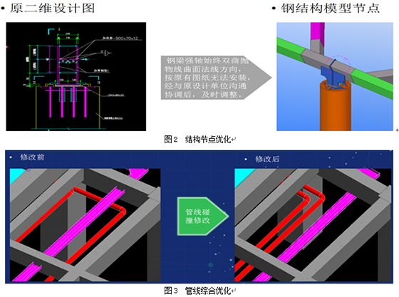 在施工前期,根據(jù)設(shè)計(jì)院提供的設(shè)計(jì)圖紙,由設(shè)計(jì)事業(yè)部各專業(yè)BIM設(shè)計(jì)人員建立相關(guān)專業(yè)模型,審核設(shè)計(jì)圖紙錯(cuò)誤,提供圖紙報(bào)告,供設(shè)計(jì)院修改施工圖紙。如鋼結(jié)構(gòu)節(jié)點(diǎn)優(yōu)化(圖2)、管線綜合優(yōu)化(圖3)