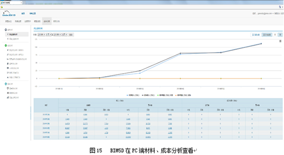 BIM5D在項(xiàng)目PC端可以清晰直觀得出項(xiàng)目施工最新信息情況,利用圖表對(duì)各信息實(shí)施分析(圖14),項(xiàng)目資金計(jì)劃使用情況,混凝土等材料使用與預(yù)計(jì)分析,滿足項(xiàng)目成本管理要求(圖15)。