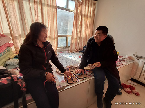 千方百計拓寬增收渠道,這是北京建工對駐村第一書記的要求,也是我在下垙村精準(zhǔn)幫扶的追求。我明白,和很多農(nóng)村一樣,下垙村有大量外出務(wù)工的青壯年,和留在村中,平均年齡不小,缺乏成規(guī)模農(nóng)業(yè)生產(chǎn)能力的村民家庭,對于下垙村的鄉(xiāng)親們來說,“兩不愁三保障”愿景的長久實現(xiàn),不能只系于一只“米袋子”上。路過村民的院子,看見院兒里扎堆兒閑坐的村民大姐們,我突然有了新的主意。“誰說‘扎堆兒坐’就不能是生產(chǎn)力?”說干就干,我趕緊行動起來,在城區(qū)通過個人關(guān)系聯(lián)系了一位精通手工藝編織的匠師,邀請老師到村里,原材料配齊,老師開始給村民們上起了編織課。針怎么穿、繩怎么走、花樣、紋路都怎么做出來、怎么定型……幾堂課下來,村民大姐們的心靈手巧讓我對自己的計劃有了更多信心,很快,一雙雙村民原始創(chuàng)意、手工編織的拖鞋開始讓下垙“手工村”的品牌在鄉(xiāng)里小有名氣。村民編織的拖鞋,不算精致、華麗、繁復(fù),卻透著原生態(tài)的質(zhì)樸和“地氣”,到2019年底,編織手工拖鞋的低收入戶增加到了8戶,編出拖鞋215雙,當(dāng)年,這8戶村民總計增收達2.3萬元。如今,疫情防控階段到來,村民們居家盤腿坐炕頭,這對編織拖鞋來說非但不受影響,反而正當(dāng)其時,在我的努力下,這些手工編織的拖鞋上線了精準(zhǔn)幫扶的網(wǎng)上平臺,很快,鄰村的訂單,北京建工四建公司工會的訂單紛至沓來,周邊一個村,一次下單就是500雙,“現(xiàn)在產(chǎn)能出來了,大姐們要開足馬力了。”在我不斷的勉勵中,大姐們一天比一天清楚地看到了勞動帶來的價值,大家一針針編織的不是拖鞋,而是自己越來越美好的日子。
