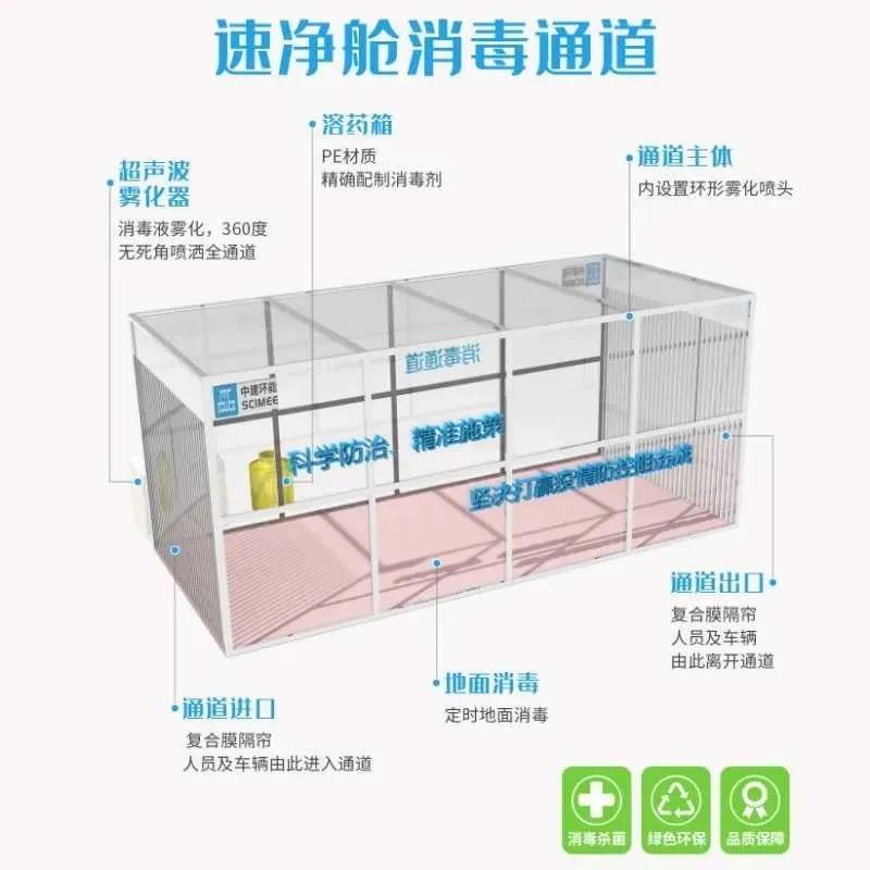中建發(fā)展統(tǒng)籌中建環(huán)能研發(fā)的“速凈艙”,便捷高效地解決人流密集場所人員及車輛防疫消毒的難題。外箱通道為環(huán)保PC材質(zhì),安全無毒無異味、抗沖擊性強(qiáng)、抗老化。采用模塊化組合,運輸、搭建方便快捷。