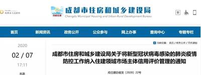 2020年2月7日,成都住建局出臺一份通知(成住建防疫發(fā)〔2020〕22號)明確:住建領域從業(yè)單位未落實主體責任,違反疫情防控相關(guān)規(guī)定,造成疫情傳播的嚴重后果,由住建主管部門參照《生產(chǎn)安全事故報告和調(diào)查處理條例》實施信用扣分: