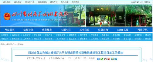 2020年2月15日,四川省住建廳發(fā)布了《關(guān)于加強疫情防控積極推進建設工程項目復工的通知》,主要內(nèi)容如下: