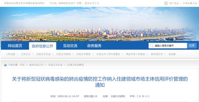 3.2、無錫住建局文件:2020年2月12日無錫住建局發(fā)布了《關(guān)于將新型冠狀病毒感染的肺炎疫情防控工作納入住建領域市場主體信用評價管理的通知》,主要內(nèi)容如下:建筑工地造成3人以上疫情確診的,視為重大安全事故。